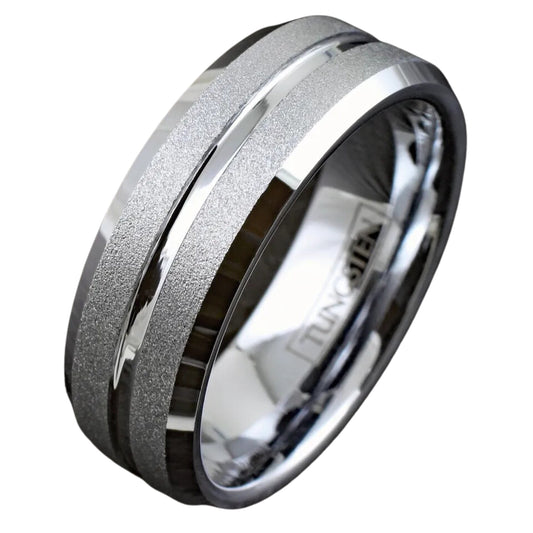 Black and Silver Sand Blast Tungsten Band | Men's Silver Inlay Groove Wedding Band Ring | Gift for Father | 8mm Elegant Ring