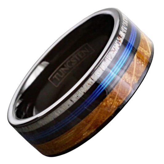 Blue Fishing Line, Deer Antler & Whiskey Barrel Wood Band for Men | Black Tungsten Men's Ring | Personalization Available