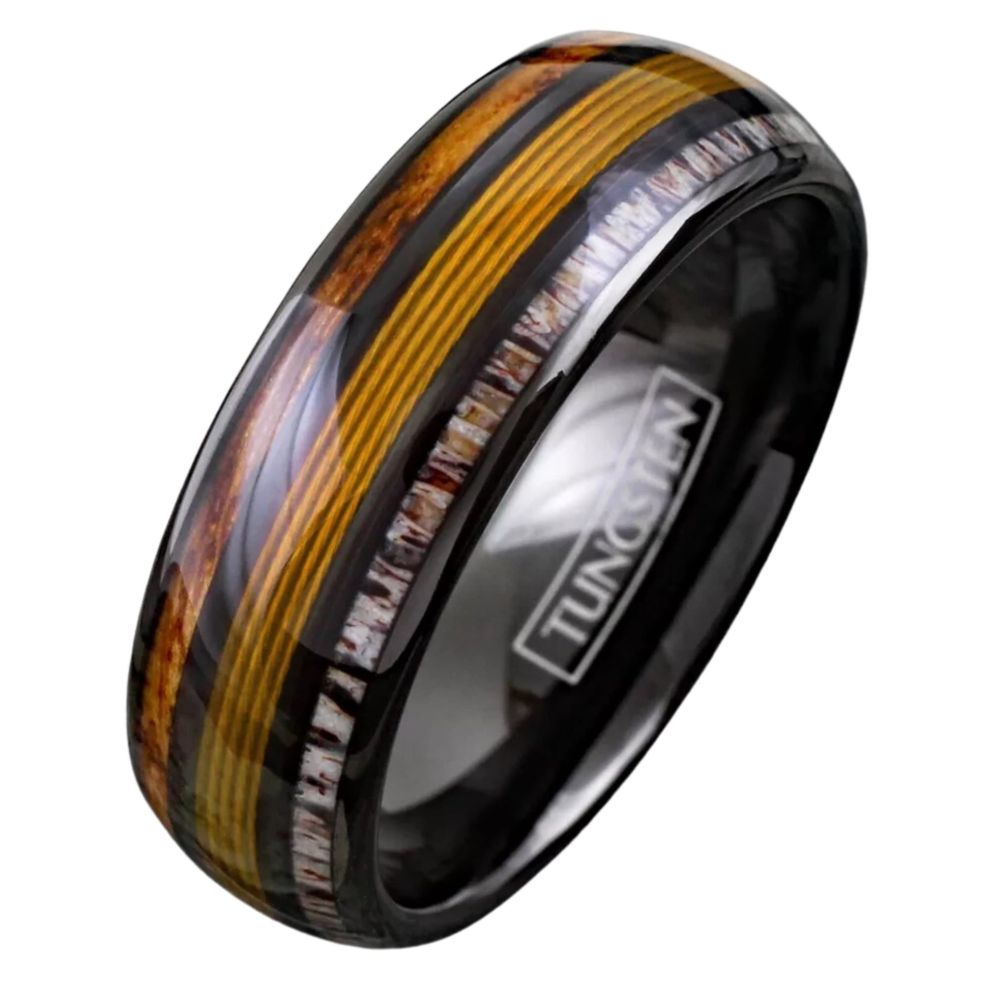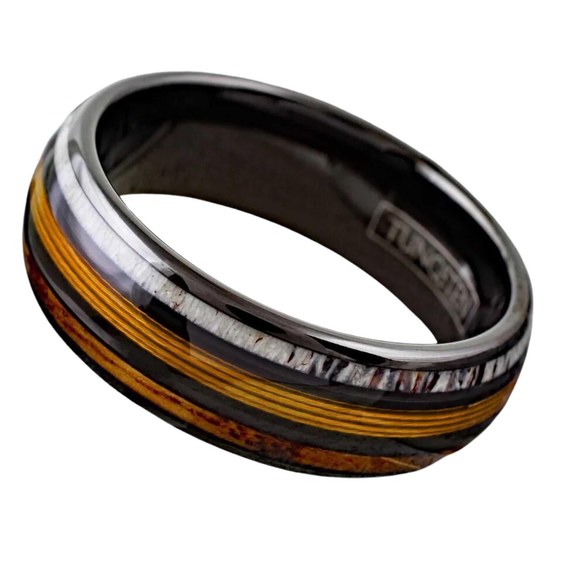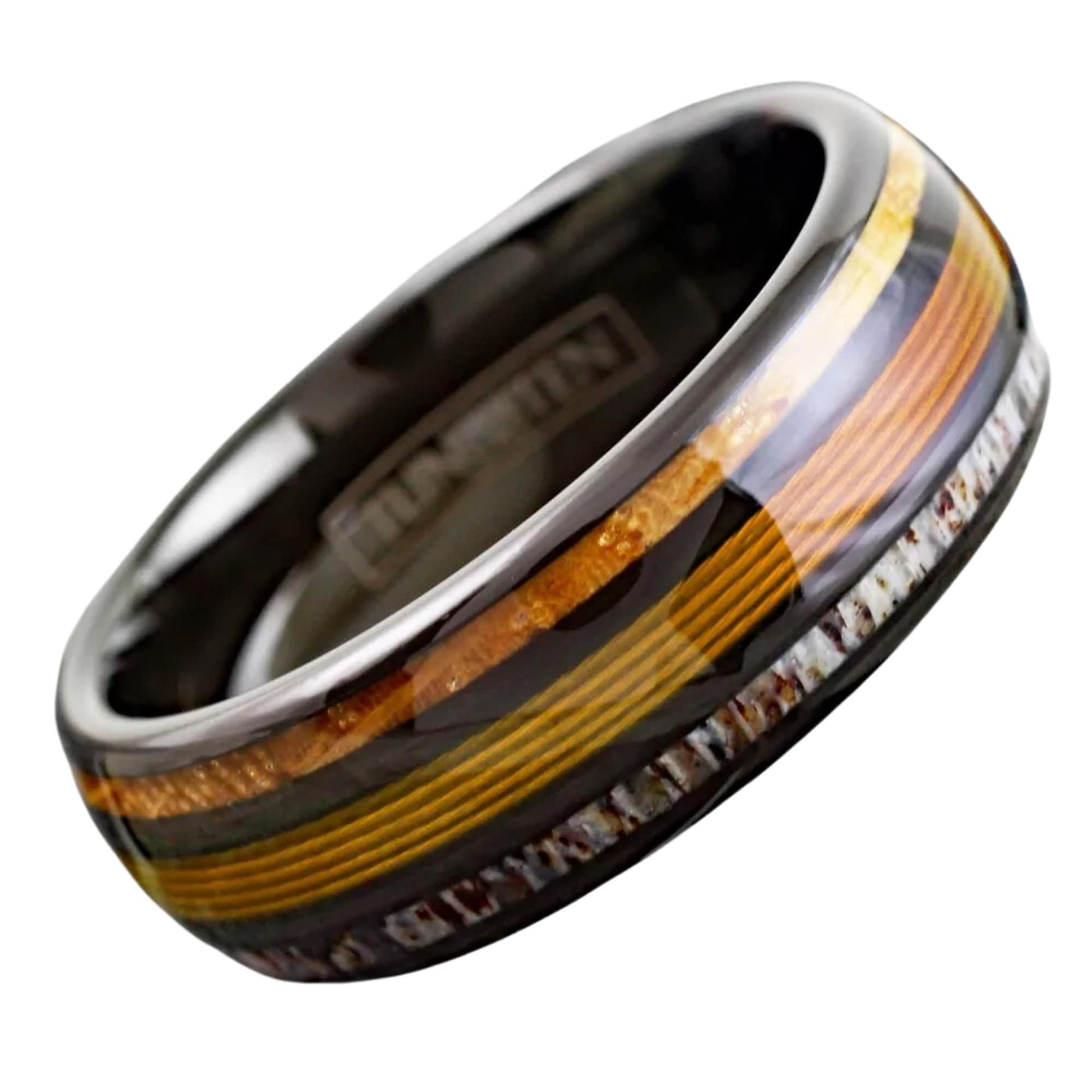 Personalized Engraved Black Tungsten Ring for Men | Whiskey Barrel & Deer Antler Ring | Gold Fishing Line Jewelry | 8mm Width