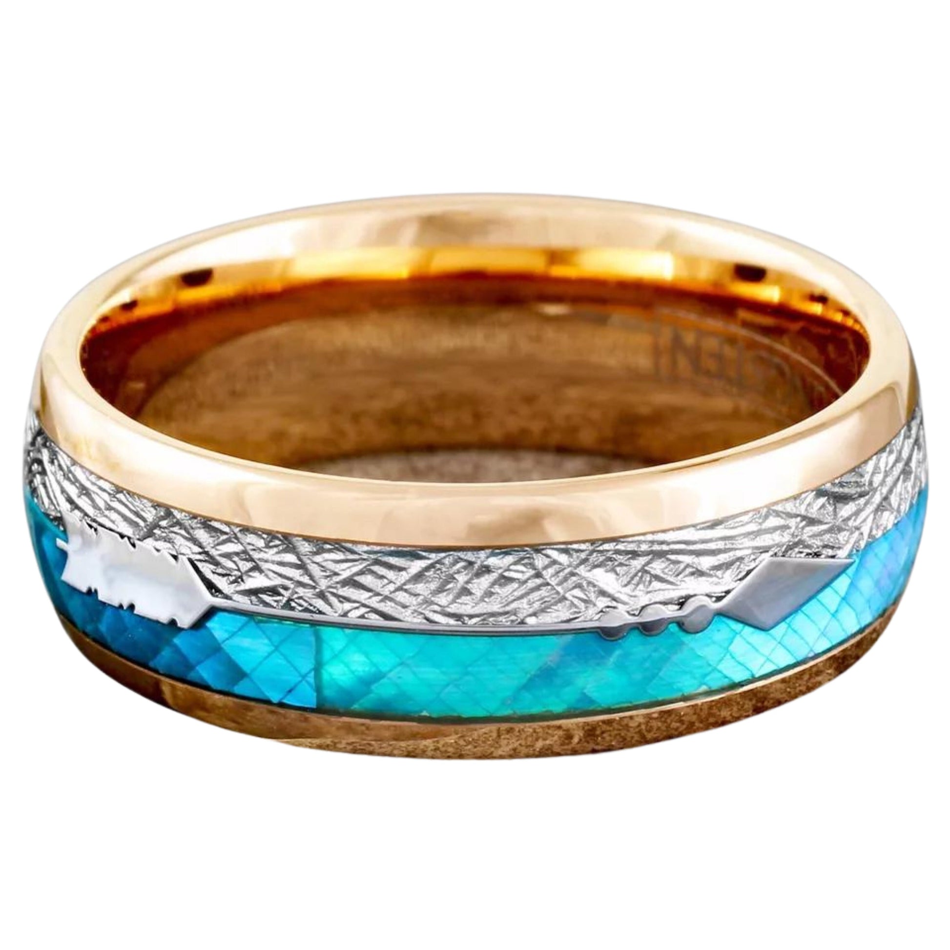 Faux Blue Opal Inlay: The striking faux blue opal inlay offers a mesmerizing play of colors, reminiscent of the ocean's depths, adding a vibrant and unique touch to the ring.